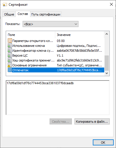 7. В диалоговом окне сертификата перейдите на вкладку Состав и найдите необходимый отпечаток (рис. 13).