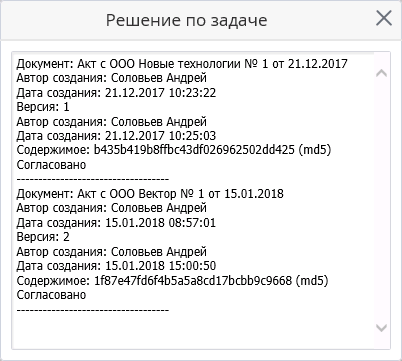 Решение по задаче содержит в себе весь подписываемый текст документов (в т.ч. атрибуты и решения по всем документам). Для просмотра содержимого решения необходимо в диалоговом окне