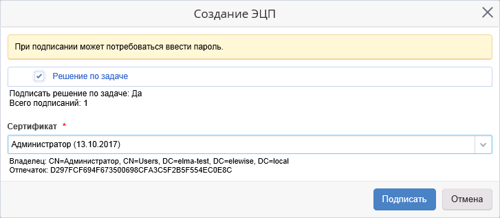 В диалоговом окне (рис. 4) необходимо один раз выбрать сертификат в поле Сертификат*, установить флажок в поле Решение по задаче и нажать на кнопку Подписать. Если в поле Решение по задаче флажок будет снят, то атрибуты документа не будут подписаны, следовательно, ЭП не сформируется.