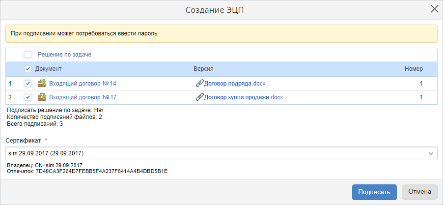 В диалоговом окне (рис. 5) необходимо один раз выбрать сертификат в поле Сертификат*, флажками отметить нужные файлы и при необходимости установить флажок в поле Решение по задаче. Далее следует нажать на кнопку Подписать.