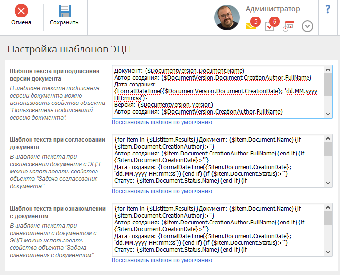 Восстановить шаблон по умолчанию – при нажатии на данную кнопку осуществляется восстановление шаблона текста, заданного в системе ELMA по умолчанию.