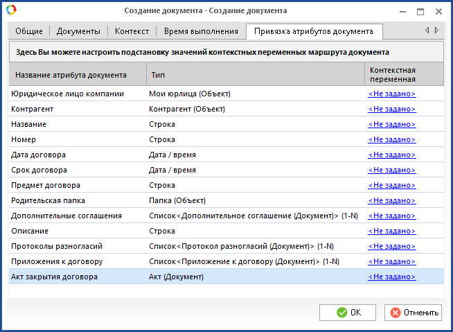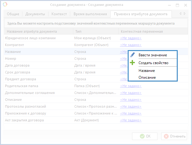 На данной вкладке при необходимости можно задать соответствие между контекстными переменными маршрута и атрибутами документа для того, чтобы значения контекстных переменных автоматически подставлялись в атрибуты документа.