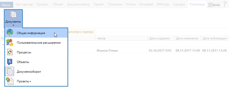 Рис. 11. Вкладка "Публикация". Кнопка "Общая информация" в расширении кнопки "Документы"