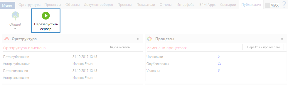 Рис. 3. Вкладка "Публикация". Кнопка "Перезапустить сервер"