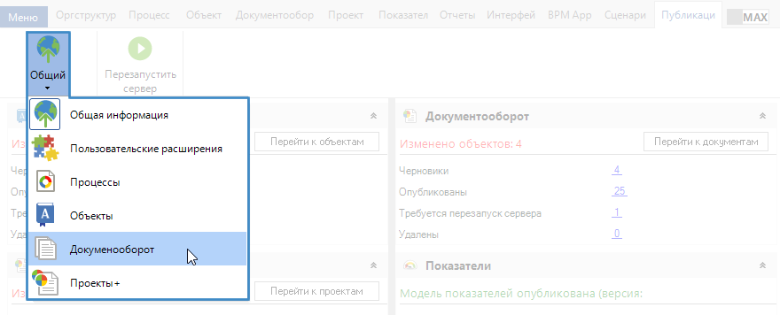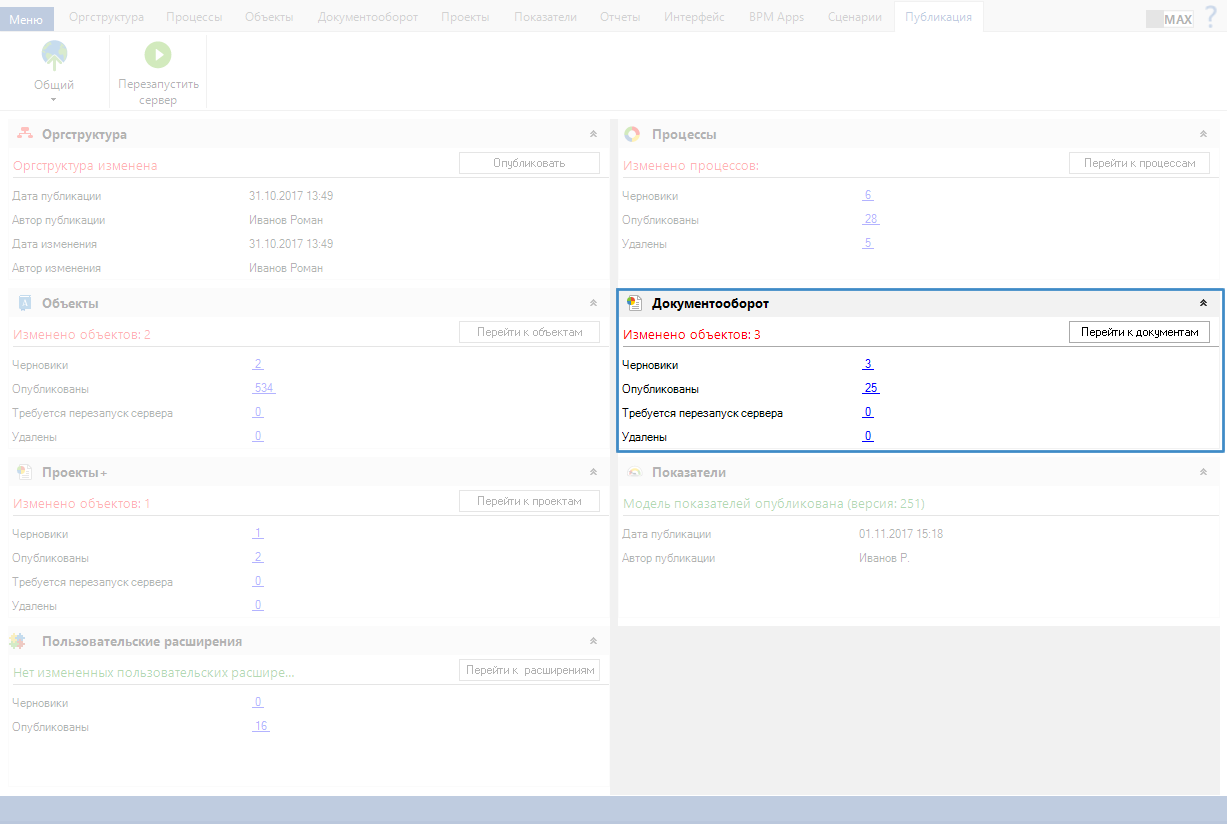 Изменено объектов – количество объектов документооборота, которые были изменены с последней публикации. Данные объекты не доступны для пользователей в веб-приложении, так как они не опубликованы.