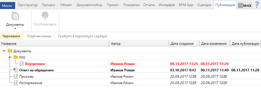 В разделе Документы вкладки Публикация Дизайнера ELMA все объекты документооборота разделены на 3 вкладки в соответствии со статусом публикации: