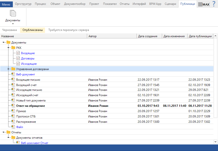 Вкладка Опубликованы - на данной вкладке отображен список всех опубликованных типов документов и РКК (рис. 9).