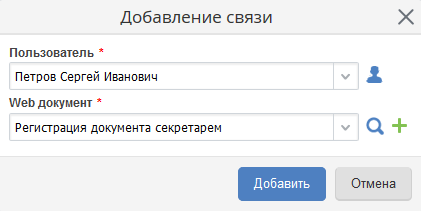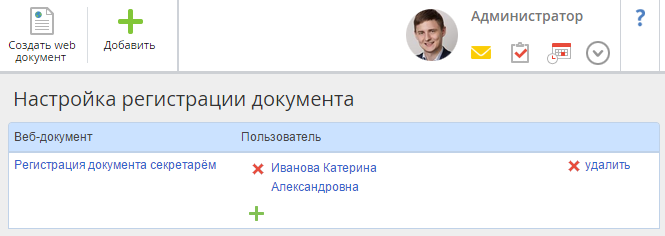 кнопка, позволяющая добавить пользователя и поставить ему в соответствие web-документ, который содержит ссылки на регистрацию определенных документов (рис.2).