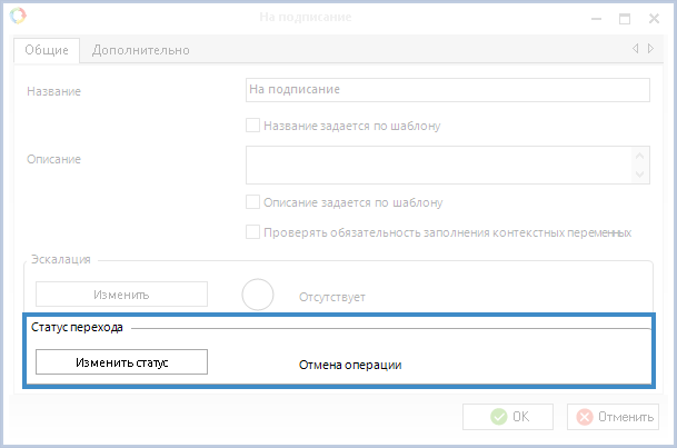Настройка перехода из операции Регистрация документа аналогична настройке простого перехода, но переход из операции Регистрация документа имеет дополнительный параметр Статус перехода (рис. 7).