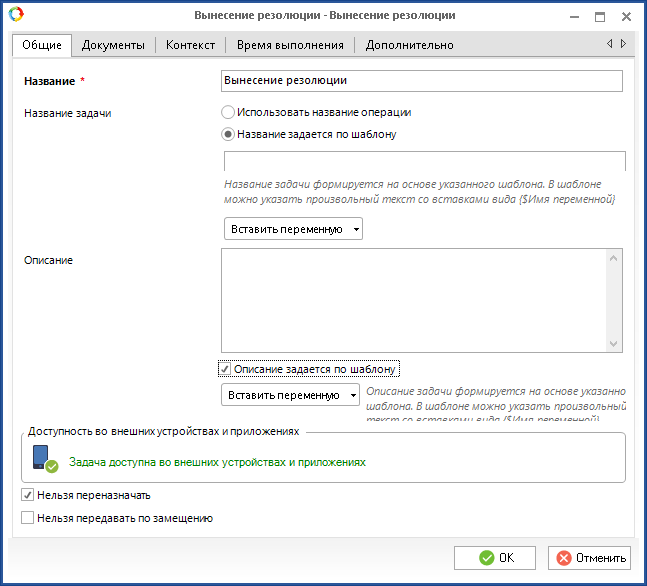 Флажок Описание задается по шаблону позволяет формировать описание задачи по шаблону. В шаблон могут входить: произвольный текст, значения контекстных переменных и параметры текущего экземпляра процесса.
