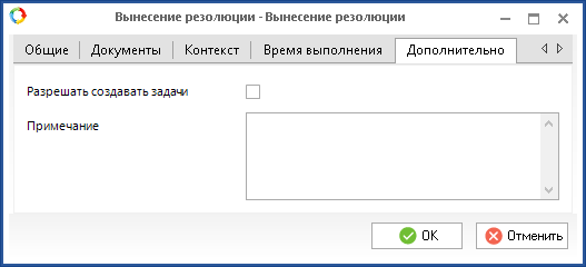 Рис. 3. Карточка операции "Вынесение резолюции". Вкладка "Дополнительно"