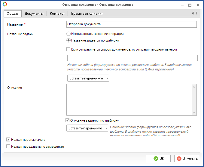 Флажок Нельзя передавать по замещению становится доступен только при установленном флажке Нельзя переназначать. Данная настройка позволяет игнорировать ранее установленные администратором настройки замещения. Например, если данная задача была назначена на пользователя, который замещается другим пользователем, то при установке флажка в данном поле задача будет поставлена на замещаемого.