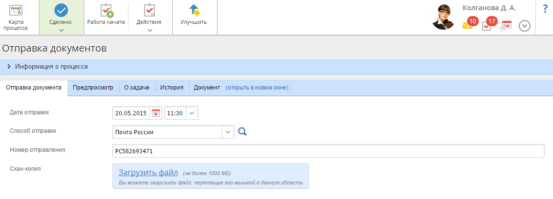 Задача отправки документов назначается исполнителю зоны ответственности, в которой находится операция Отправка документа. Данная задача позволяет организовать контроль отправки документов. Пример задачи отправки документа представлен на рис. 5.