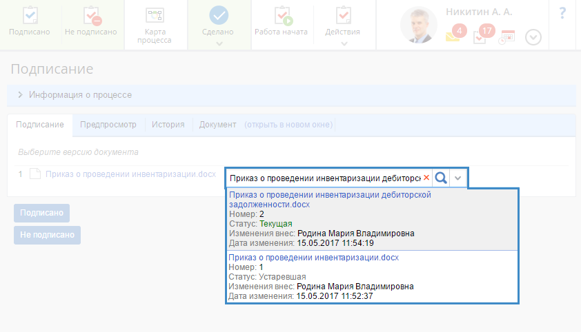 Не подписано – при нажатии на данную кнопку процесс будет направлен по исходящему переходу со статусом Не подписано. Ее необходимо нажать после того, как пользователь ознакомился с документом и принял решение не подписывать документ.