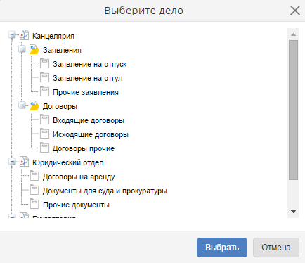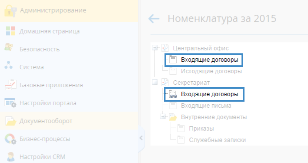 Ссылка на дело - в документообороте системы ELMA каждое дело находится в определенном месте регистрации. Но иногда возникает необходимость регистрации документов в одном общем деле. Для этого в номенклатуре в первом месте регистрации создается само дело, а во втором месте регистрации создается ссылка на это дело. Например, в месте регистрации "Центральный офис" в создано дело "Входящие договоры". Необходимо, чтобы в месте регистрации "Секретариат" был доступ к делу "Входящие договоры" - при этом необходимо создать ссылку на дело "Входящие договоры" из места регистрации "Центральный офис". Такая настройка обеспечит возможность регистрации документов в общем деле в обоих местах регистрации, используя единую систему нумерации документов этого дела и т.п. (рис. 1)