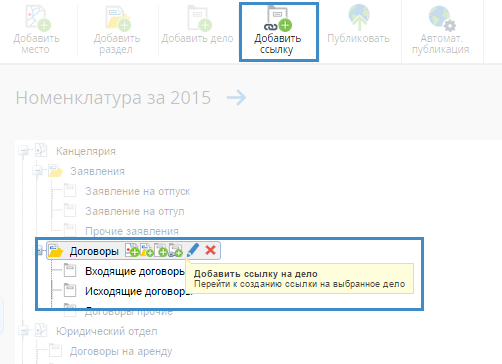 Ссылку на дело можно создать в веб-приложении в разделе Администрирование – Документооборот – Номенклатура. Для этого необходимо: