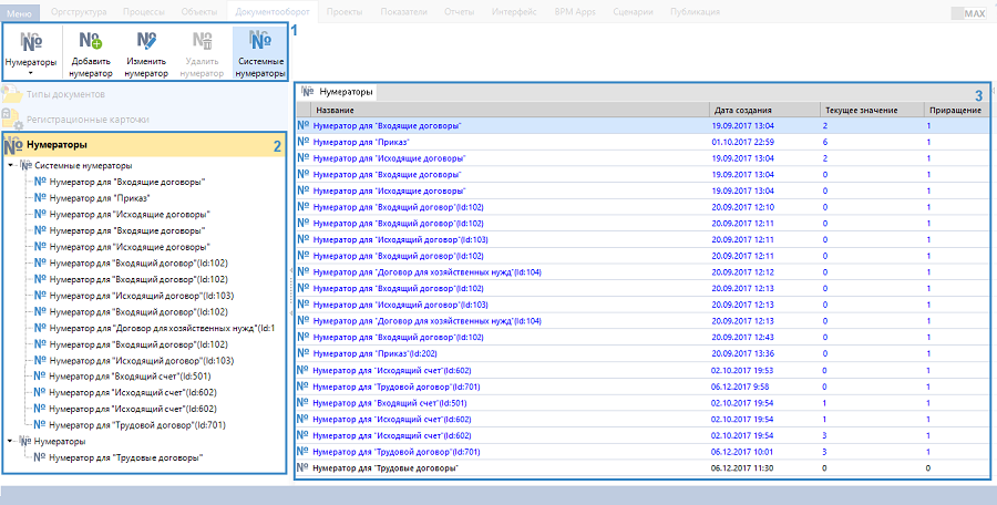 Дерево нумераторов представляет собой список всех нумераторов системы, разделенных на 2 группы: Системные нумераторы и Нумераторы (рис. 1, цифра 2):