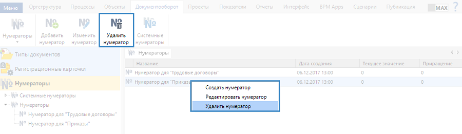 Удалить пользовательский нумератор можно несколькими способами. Для этого необходимо выбрать требуемый нумератор в списке и нажать на одну из кнопок: