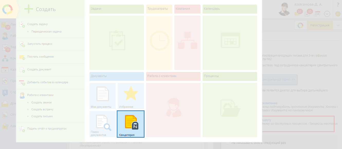 Рис. 1. Раздел "Канцелярия" в главном меню главной страницы системы в разделе "Документы"