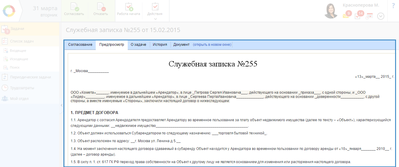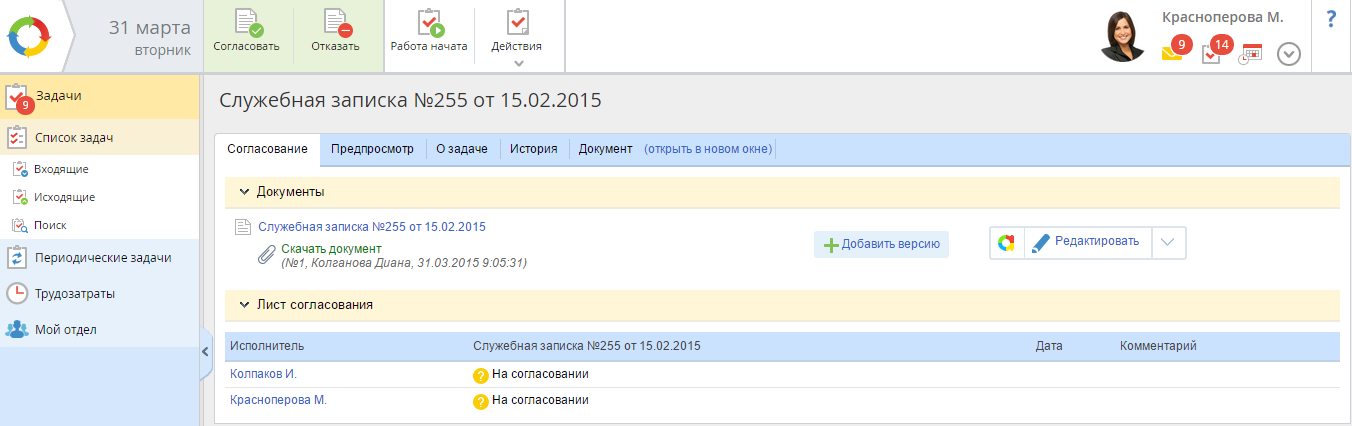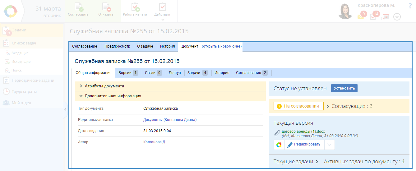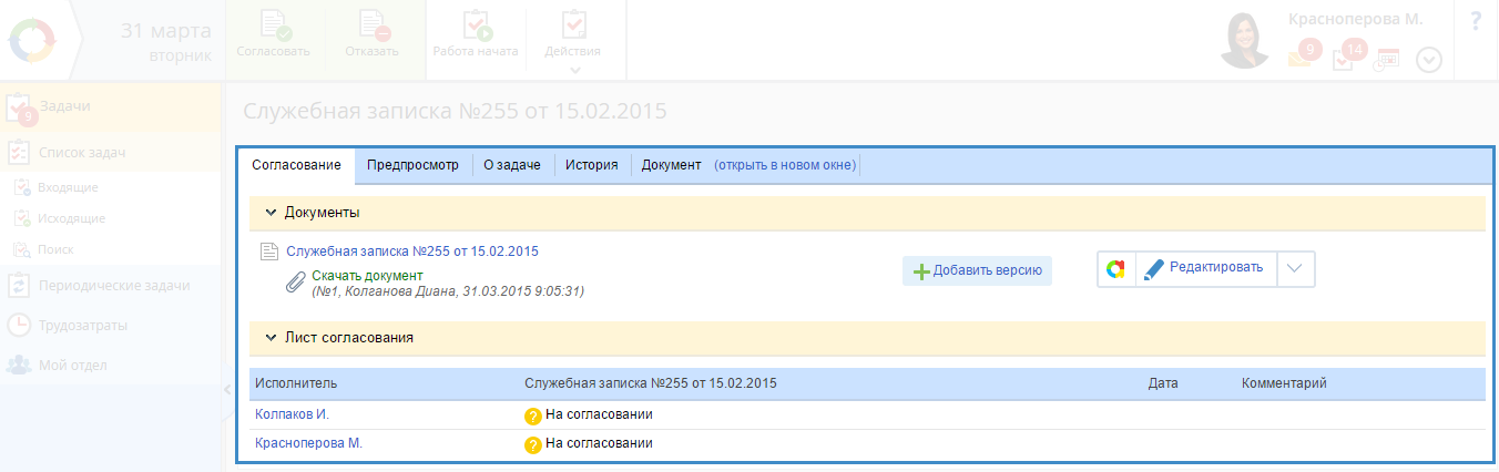 Все созданные подзадачи отображаются в задаче согласования на вкладке Подзадачи (рис. 9) и на вкладке Задачи карточки документа. Следует отметить, что уровень вложенности подзадач не ограничивается.