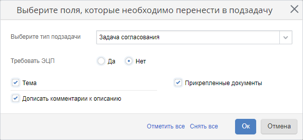 путем установки флажков выбрать поля, которые требуется перенести в подзадачу. При нажатии на ссылку