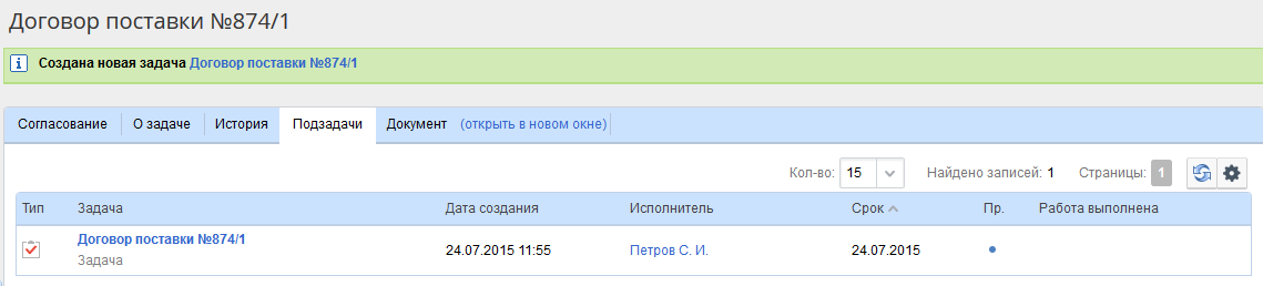 Подзадачи – на данной вкладке отображаются все подзадачи, созданные в рамках данной задачи согласования. Данная вкладка отображается только в том случае, если создана хотя бы одна подзадача.