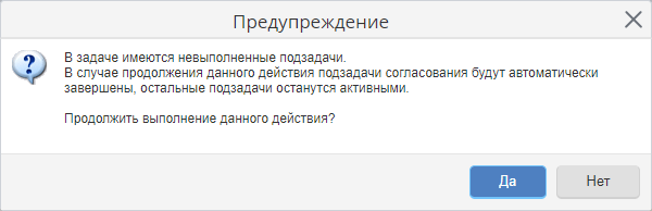 При попытке выполнить задачу, у которой имеются активные подзадачи, откроется диалоговое окно с предупреждением о наличии невыполненных подзадач (рис. 10). В случае, если нажать на кнопку Да, активные подзадачи согласования будут завершены, а простые подзадачи и подзадачи ознакомления останутся в системе. Далее откроется окно выполнения задачи.