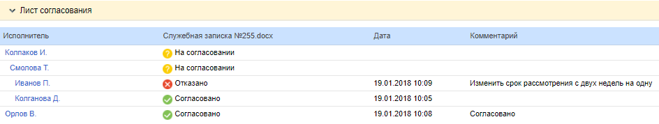 Переназначить – позволяет переназначить задачу другому пользователю. Если пользователь, на которого переназначается задача, уже есть в листе согласования, то при определенных настройках дубликат данного пользователя может быть удален из листа согласования, а переназначенная задача согласования будет снята с него. Также при переназначении задачи дубликат пользователя может быть оставлен в листе согласования. Это значит, что он получит 2 и более одинаковые задачи согласования, а в листе согласования могут оказаться 2 и более одинаковых пользователя. Кроме того, при переназначении задачи согласования ее исполнителем в листе согласования помимо согласующего пользователя в скобках будет указан первый исполнитель задачи;