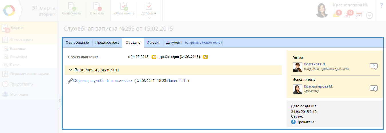 О задаче – вкладка содержит служебную информацию о задаче: срок выполнения, добавленные к задаче вложения, автор, исполнитель, дата создания и статус задачи (рис.4).