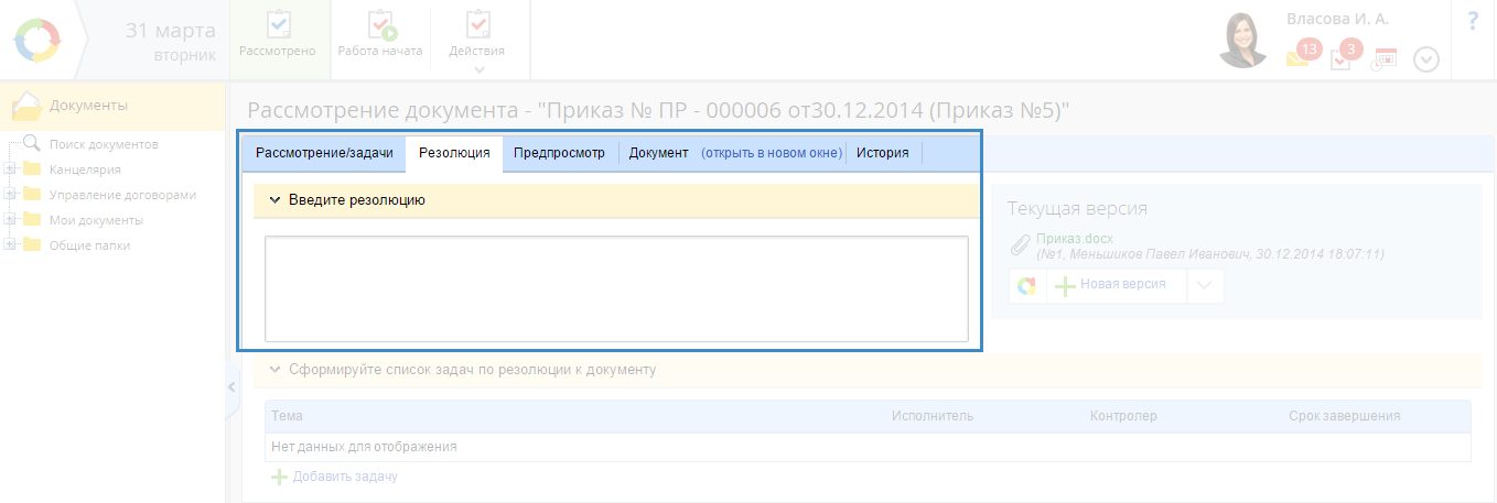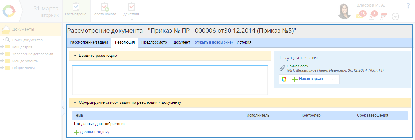 Задача рассмотрения содержит 5 вкладок: Рассмотрение/задачи, Резолюция, Предпросмотр, Документ, История.