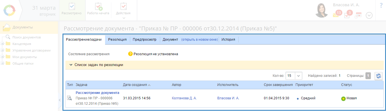 В том случае, если пользователь назначил задачи по резолюции, состояние рассмотрения документа устанавливается Исполнение задач по резолюции.