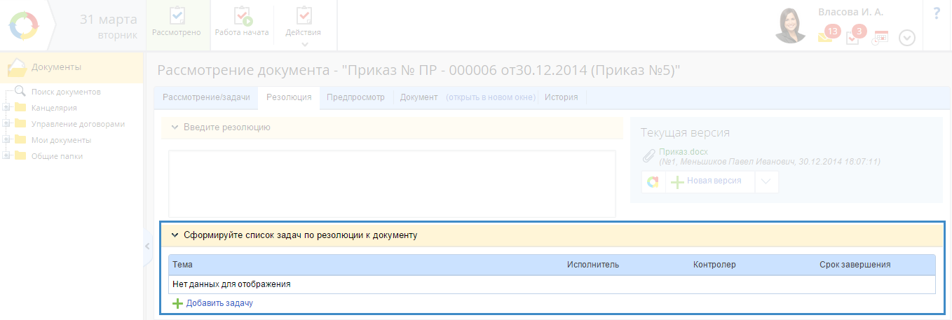 2. Сформируйте список задач по резолюции к документу – таблица данных, которая содержит информацию обо всех задачах по резолюции – тема задачи, исполнитель, контролер, срок завершения. Также в этом блоке добавляются новые задачи по резолюции – разовые пользовательские поручения (рис.4).