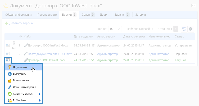 Рис. 2. Контекстное меню версии документа. Кнопка "Подписать"