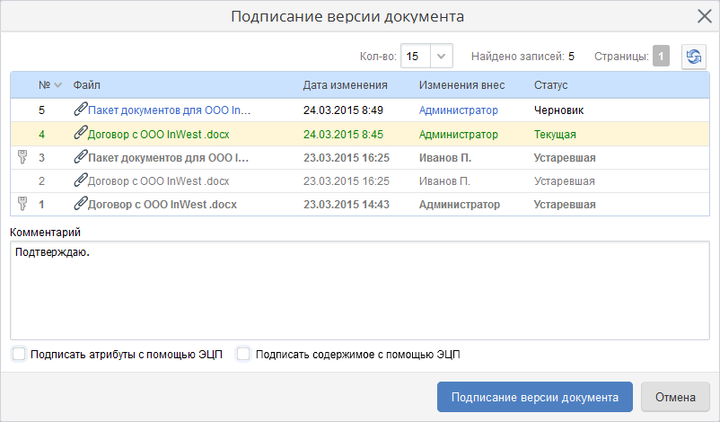 выбрать требуемую версию документа путем нажатия на нее кнопкой мыши. Следует отметить, что при этом для выбора недоступны подписанные ранее версии;