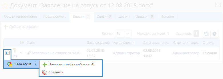 Подписанная версия недоступна для редактирования как в веб-приложении ELMA, так и в ELMA Агенте. При этом в карточке документа на вкладке Версии в контекстном меню подписанной версии доступен только пункт ELMA Агент (рис. 5).
