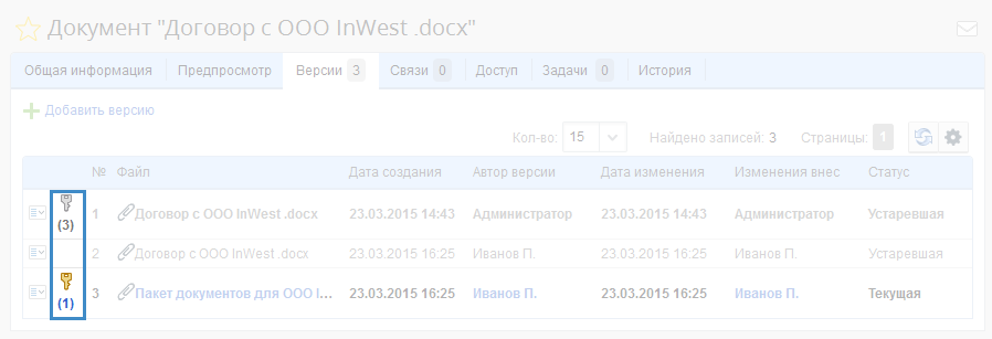 Рис. 6. Карточка документа. Вкладка "Версии". Информация о наличии/отсутствии подписи у версии документа