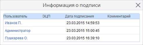 Рядом с данными обозначениями располагаются ссылки в формате (кол-во подписей). При нажатии на данную ссылку будет отображено диалоговое окно (рис. 7) с краткой информацией о пользователях, подписавших текущую версию документа, наличии ЭЦП, а также о дате подписания и наличии комментария.