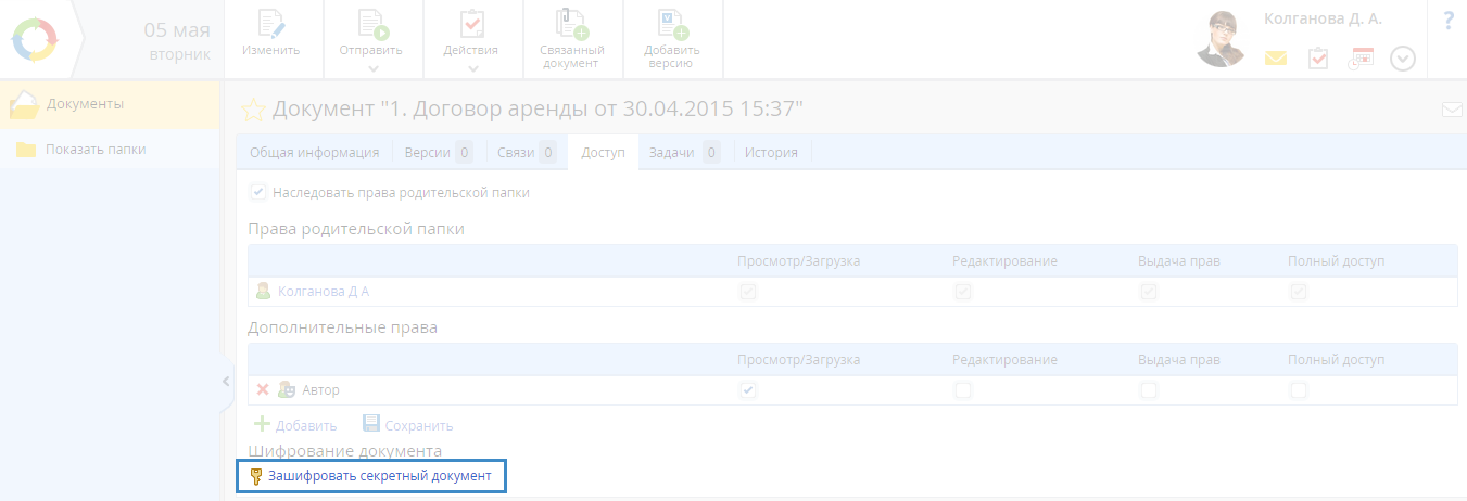 Рис. 1. Карточка документа. Вкладка "Доступ". Кнопка "Зашифровать секретный документ"