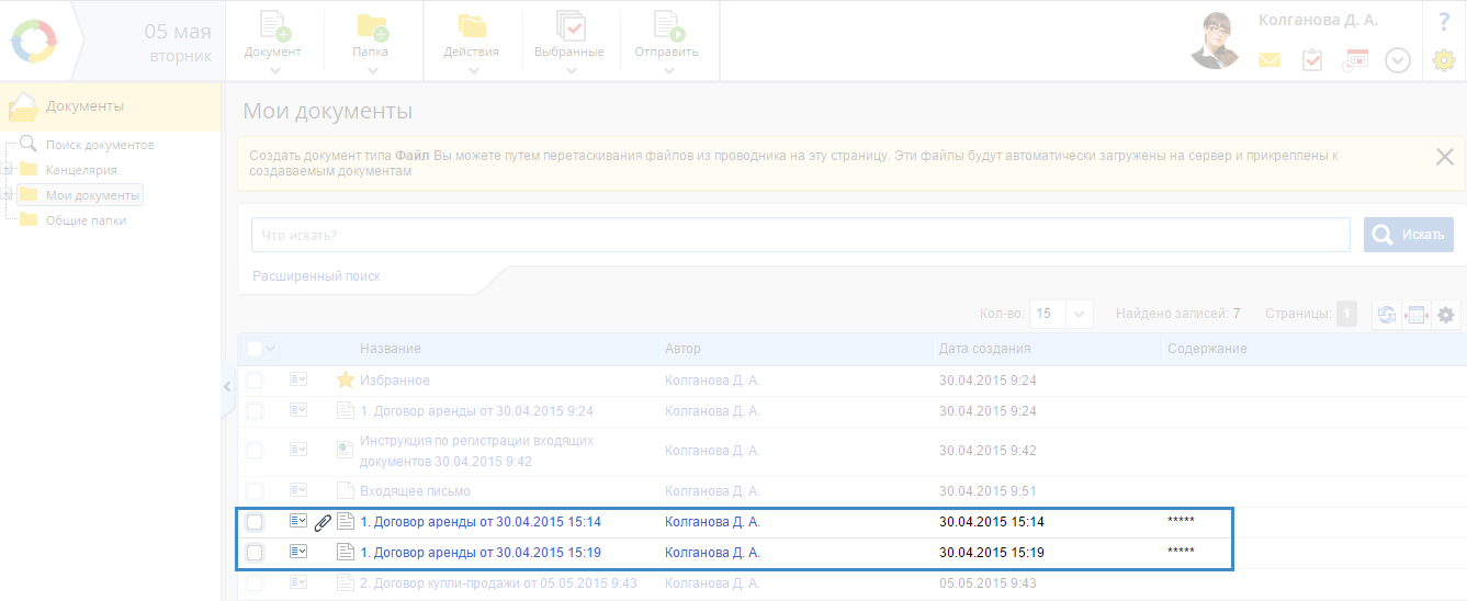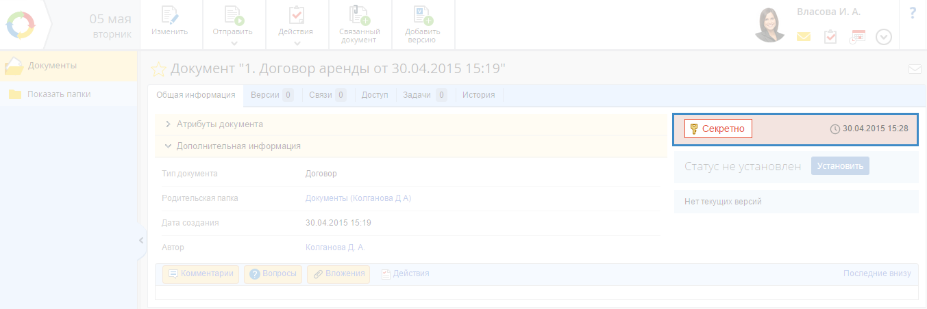 в карточке документа на вкладке Общая информацияотображается блок Секретно с указанием даты и времени шифрования документа (рис. 5).
