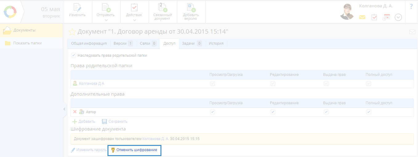 Рис. 9. Карточка документа. Вкладка "Доступ". Кнопка "Отменить шифрование"