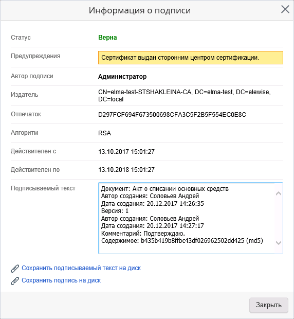 В нижней части диалогового окна Информация о подписи расположены ссылки для скачивания подписи и подписанного текста документа. В случае использования внешнего криптопровайдера и установки флажка Подписать содержимое с помощью ЭЦП (рис. 5) в данном диалоговом окне (рис. 8) появится ссылка для скачивания подписанного документа. Данная возможность позволяет сохранить и отправить скаченные файлы на проверку подлинности ЭЦП.