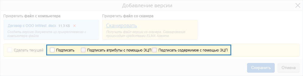Рис. 4. Диалоговое окно добавления версии документа. Кнопки "Подписать", "Подписать атрибуты с помощью ЭЦП" и "Подписать содержимое с помощью ЭЦП"