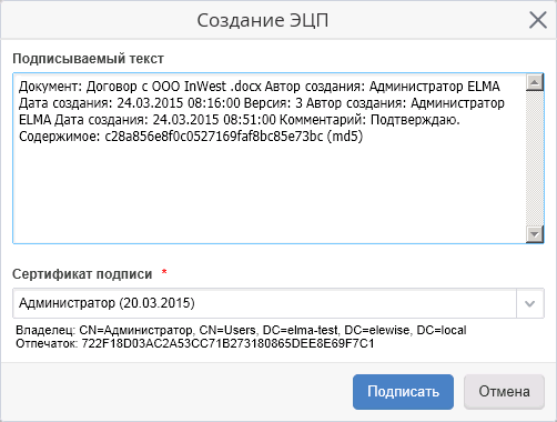 Электронный документ в системе ELMA может быть подписан несколькими способами. Для этого необходимо: