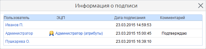 Рядом с данными обозначениями располагаются ссылки в формате (кол-во подписей). При нажатии на данную ссылку будет отображено диалоговое окно (рис. 7) с краткой информацией о пользователях, подписавших текущую версию документа, наличии ЭЦП, а также о дате подписания и наличии комментария.