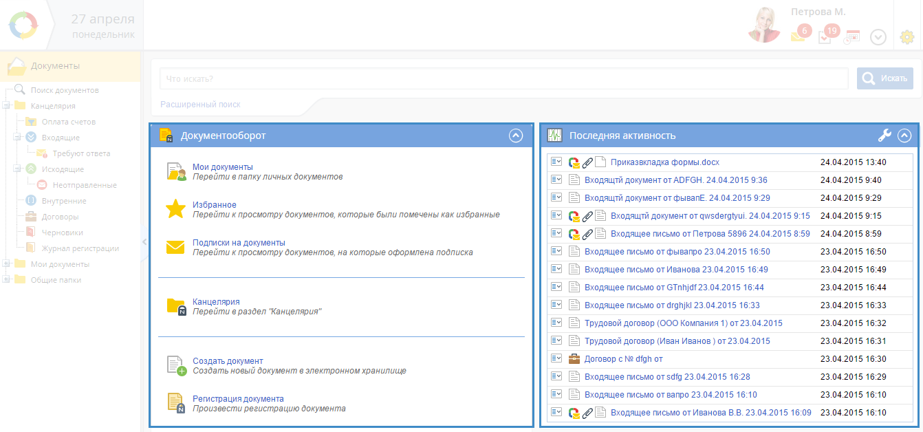 Рис. 2. Раздел "Документы". Портлеты "Документооборот" и "Последняя активность"