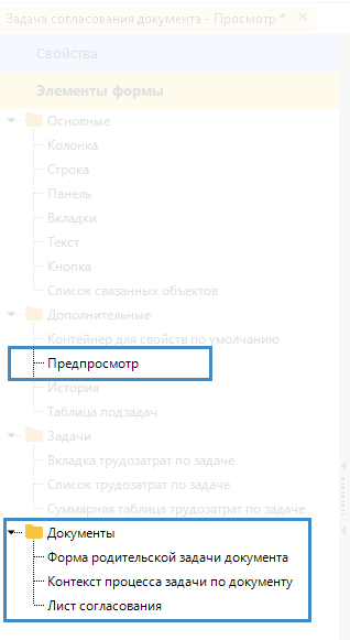 При редактировании формы задачи согласования документа в блоке Элементы формыпоявляется группа Документы, а также в группе Дополнительные элемент Предпросмотр (рис. 2).