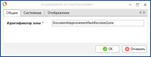 На вкладке Согласование отображается элемент Зона ‘DocumentApprovementTaskResolverZone’, который обеспечивает отображение на форме блока Документы. Данный элемент может быть настроен. Диалоговое окно настройки данного элемента содержит 3 вкладки: Общие, Системные и Отображение (рис. 3).