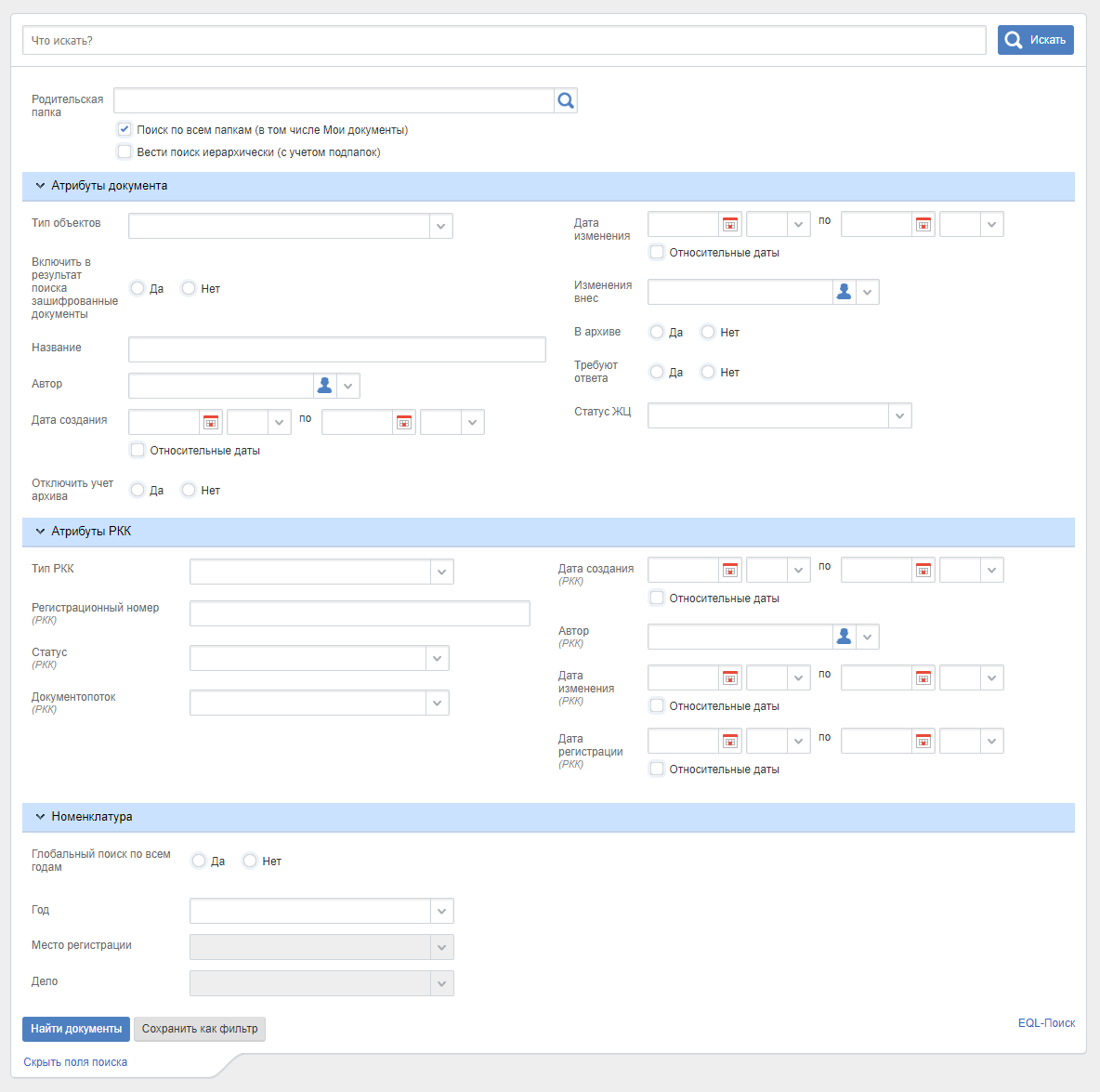 Нет – поиск документов будет осуществляться в номенклатуре за один календарный год. При установленной настройке отображаются дополнительные поля: Год и Место регистрации.