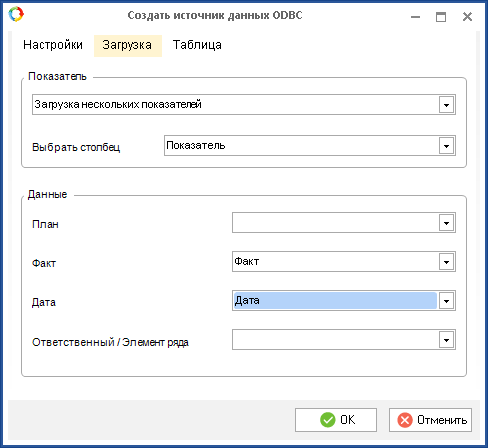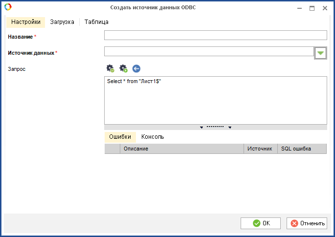 Будет открыто окно Создать источник данных ODBC (рис. 7). Данное окно состоит из 3 вкладок: Настройки, Загрузка, Таблица. В данном окне требуется заполнить необходимые поля и нажать на кнопку OK.