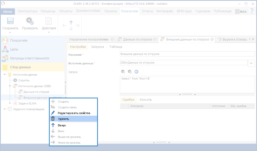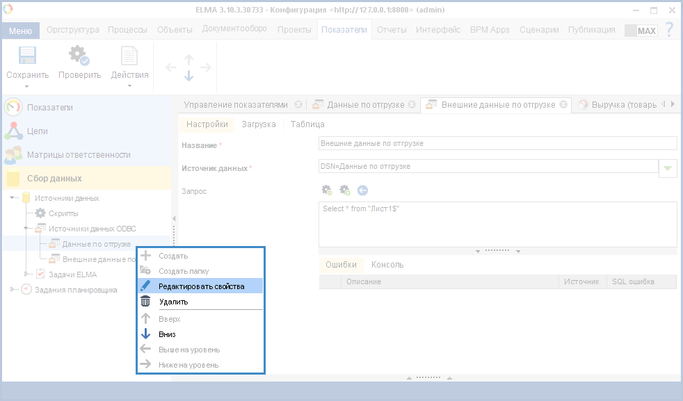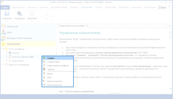 Рис. 6. Дизайнер ELMA. Вкладка "Показатели". Раздел "Сбор данных". Контекстное меню подраздела "Источники данных ODBC". Кнопка "Создать"